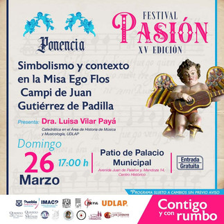 En Puebla se vuelve a vivir la tradición de música sacra con el Festival Pasión, el 25 de marzo, a partir de las 15:00 horas el centro histórico será sede de las ponencias sobre el contexto cultural de Gutiérrez de Padilla y la República de Indios en Puebla, más tarde podrán disfrutar del Concierto “Aries del Barroco Europeo”. El 26 de marzo a las 12:00 horas tocará la Banda Sinfónica Municipal con “De Bach a Zimmer”, a las 17:00 horas en el Patio de Palacio Municipal la Dra. Luisa Vilar- Payá presenta la ponencia “Simbolismo y contexto en la Misa Ego Flos Campi de Juan Gutiérrez de Padilla” y a las 19:00 horas se proyectará el documental “Gurumbé, canciones de tu memoria negra”.